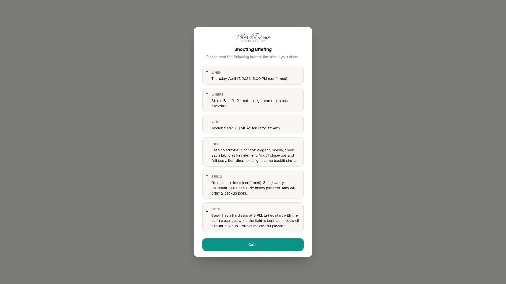 Moodboard-Abstimmung, Planungsbilder, Freigaben - alles auf einem Link. Ohne dass du noch mal nachfragen musst.